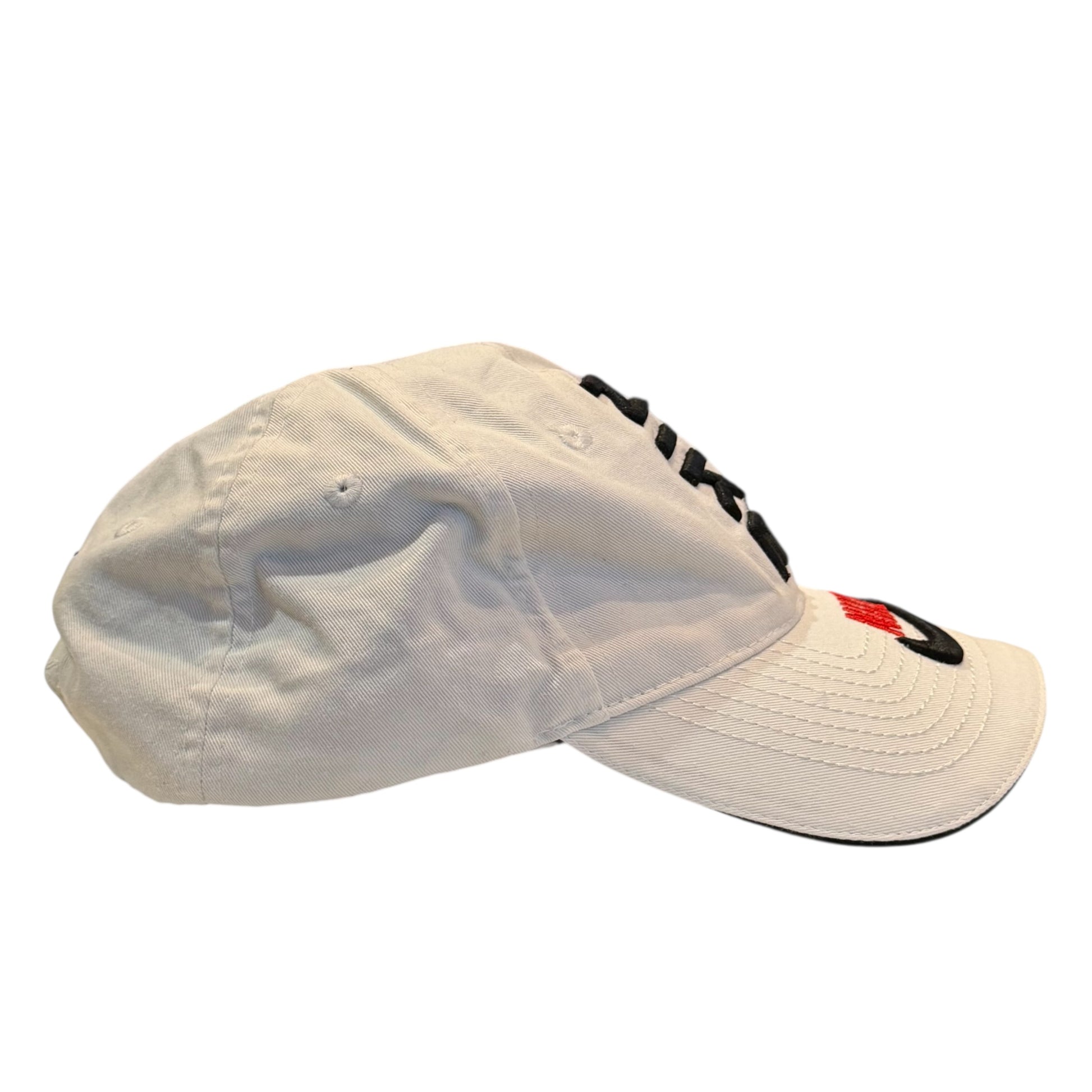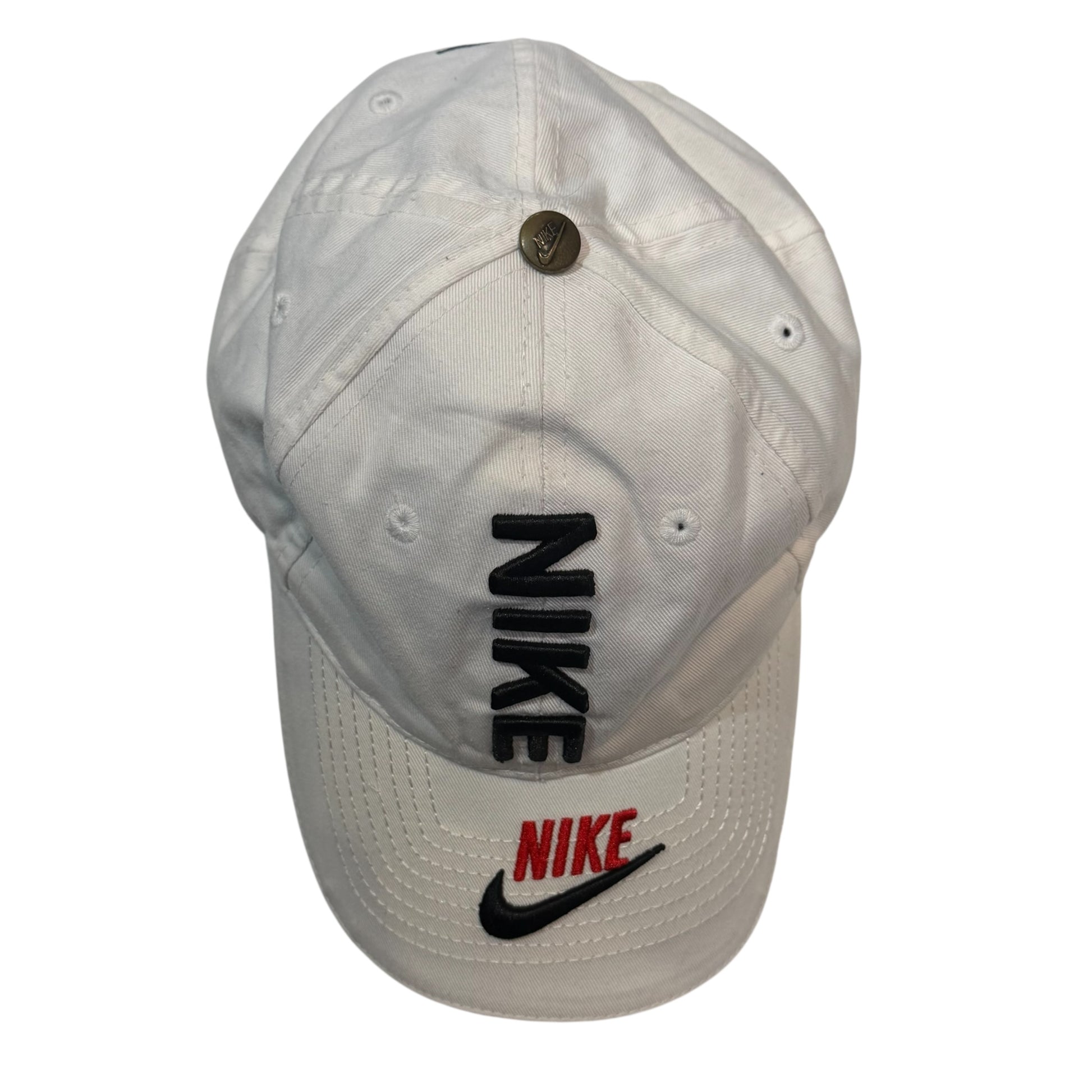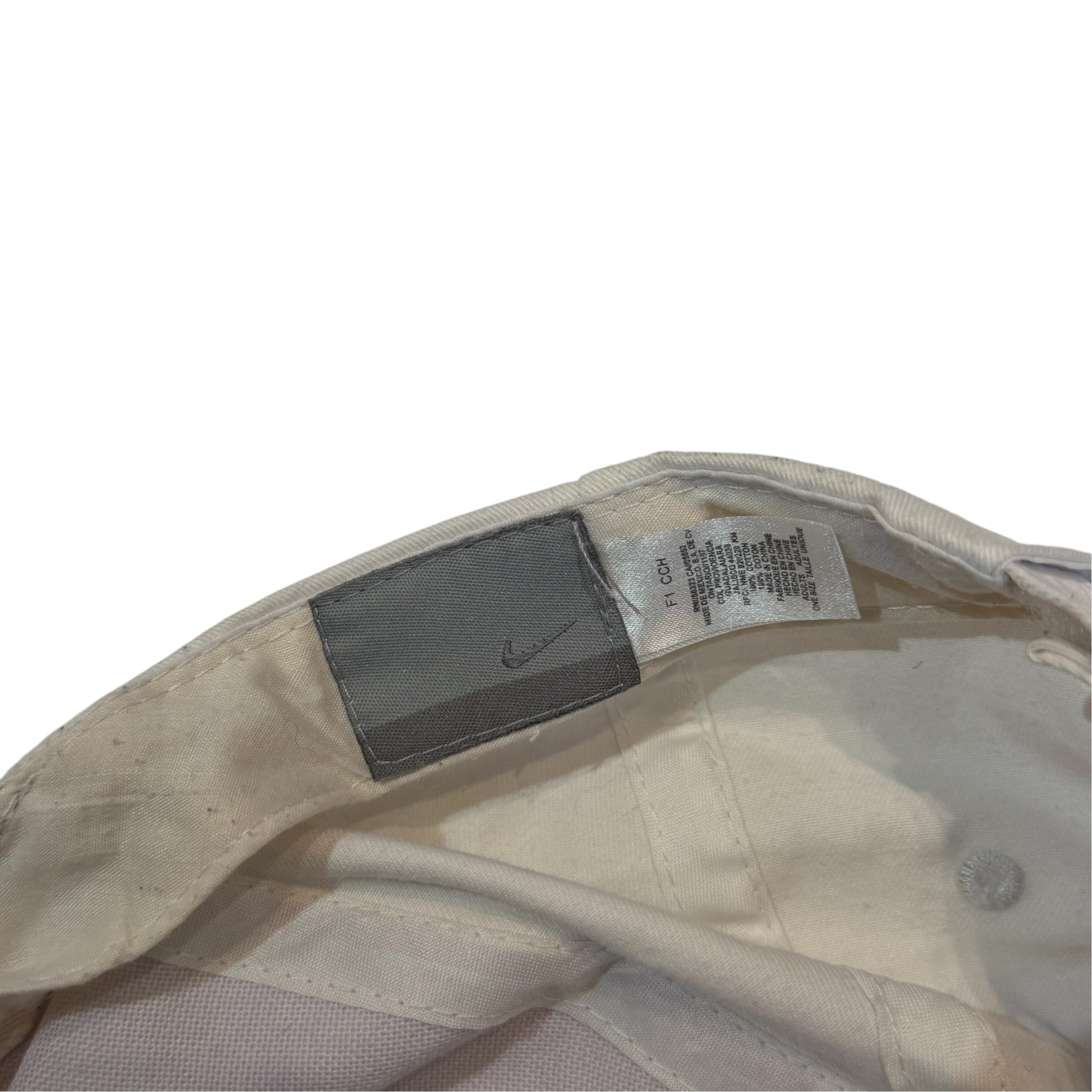Authentic vintage Nike cap in white featuring bold embroidered Nike branding on the front and brim.